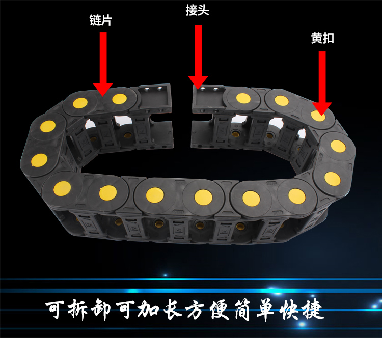 尼龍坦克鏈能夠更好地保證拖鏈的使用壽命。選購穿線尼龍坦克鏈時,需要選擇內置的電纜、油管、氣管、水管等中最粗的一根作為參考高度,加上至少10%的高度空間作為拖鏈的內置高度。如果電纜油管、氣管、水管等需要重疊時,按重疊后的實際高度作為參考高度。